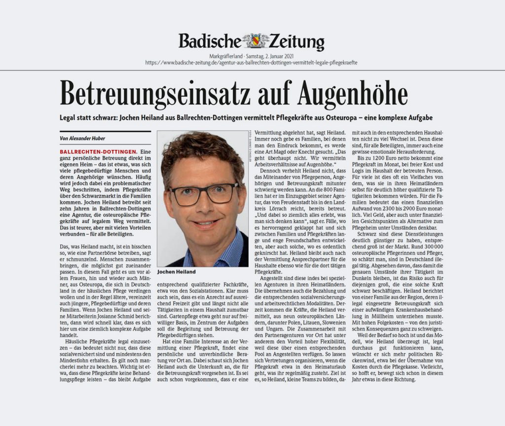 Seit 2011 vermitteln wir gesetzeskonform 24-Stunden-Pflege- und Betreuungskräfte aus Osteuropa. In dieser Zeit haben wir weit über 1.000 Familien in der Region begleitet und unterstützt.